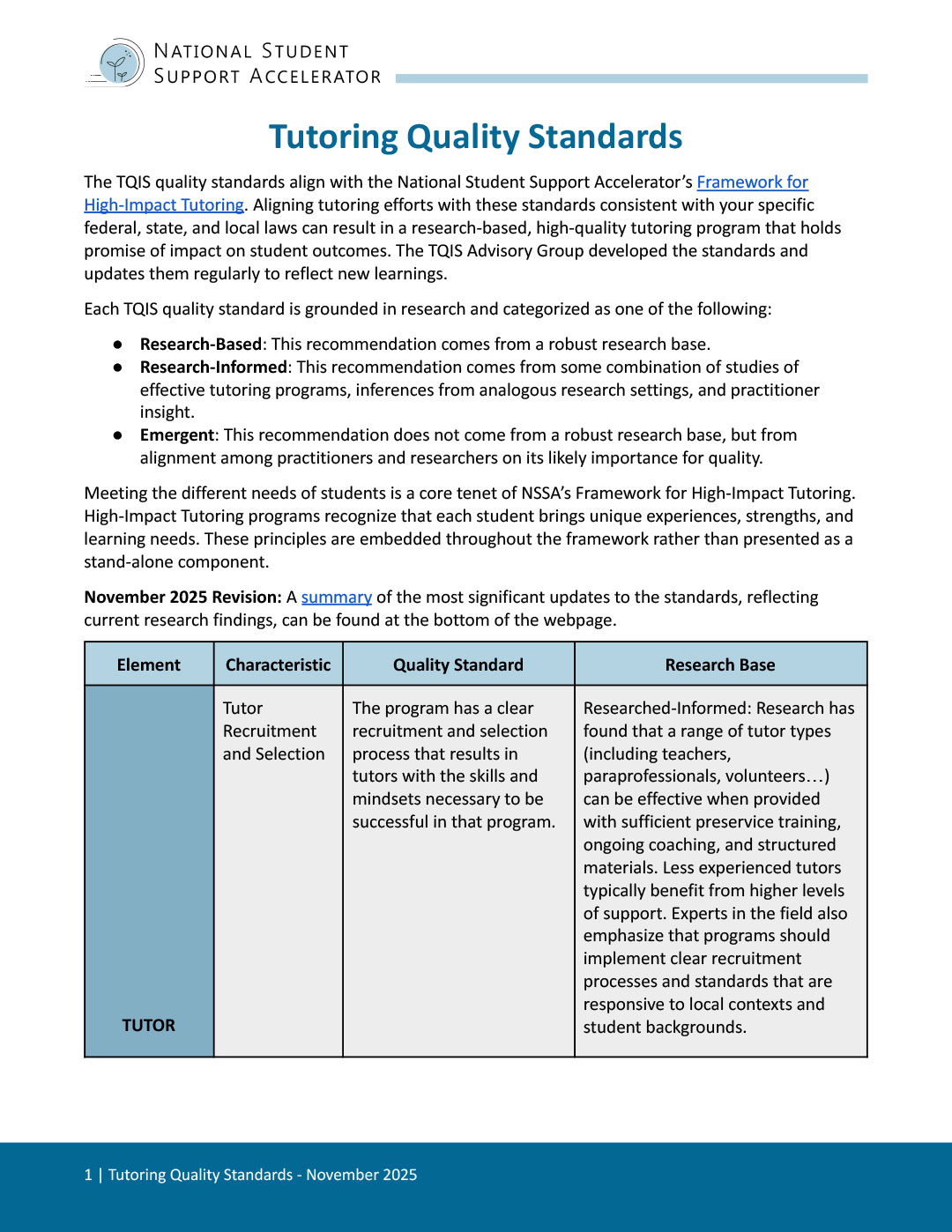 The TQIS quality standards align with the National Student Support Accelerator’s Framework for High-Impact Tutoring. Aligning tutoring efforts with these standards consistent with your specific federal, state, and local laws can result in a research-based, high-quality tutoring program that holds promise of impact on student outcomes.